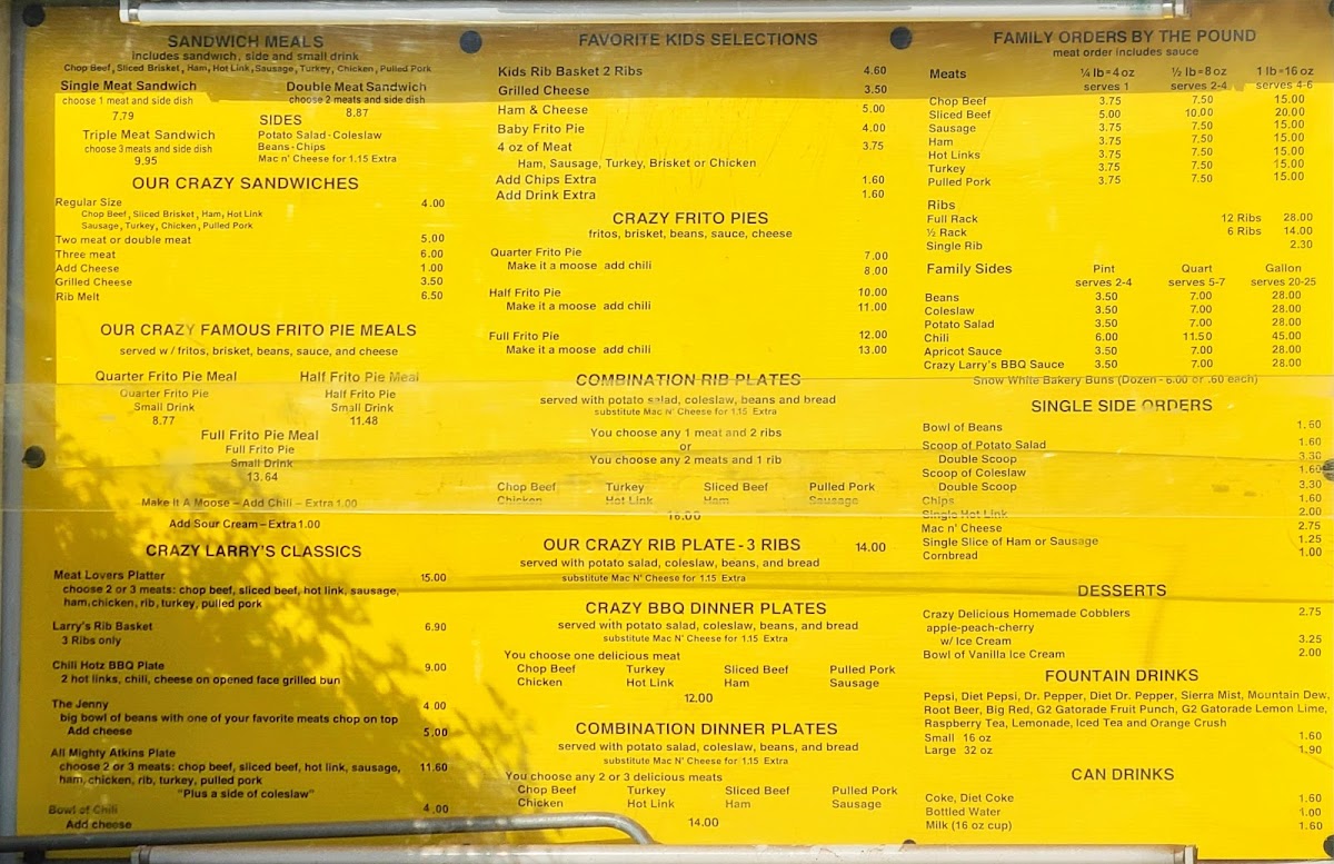 The menu brims with delicious offerings such as the acclaimed Frito Pie—a favorite among patrons, perfect for satisfying your hunger. Customers rave about the combination rib plate and the mouthwatering 3 meat Adkins plate, each prepared with quality ingredients and expert care. The friendly service adds to the inviting atmosphere, ensuring you feel welcomed from the moment you walk in.